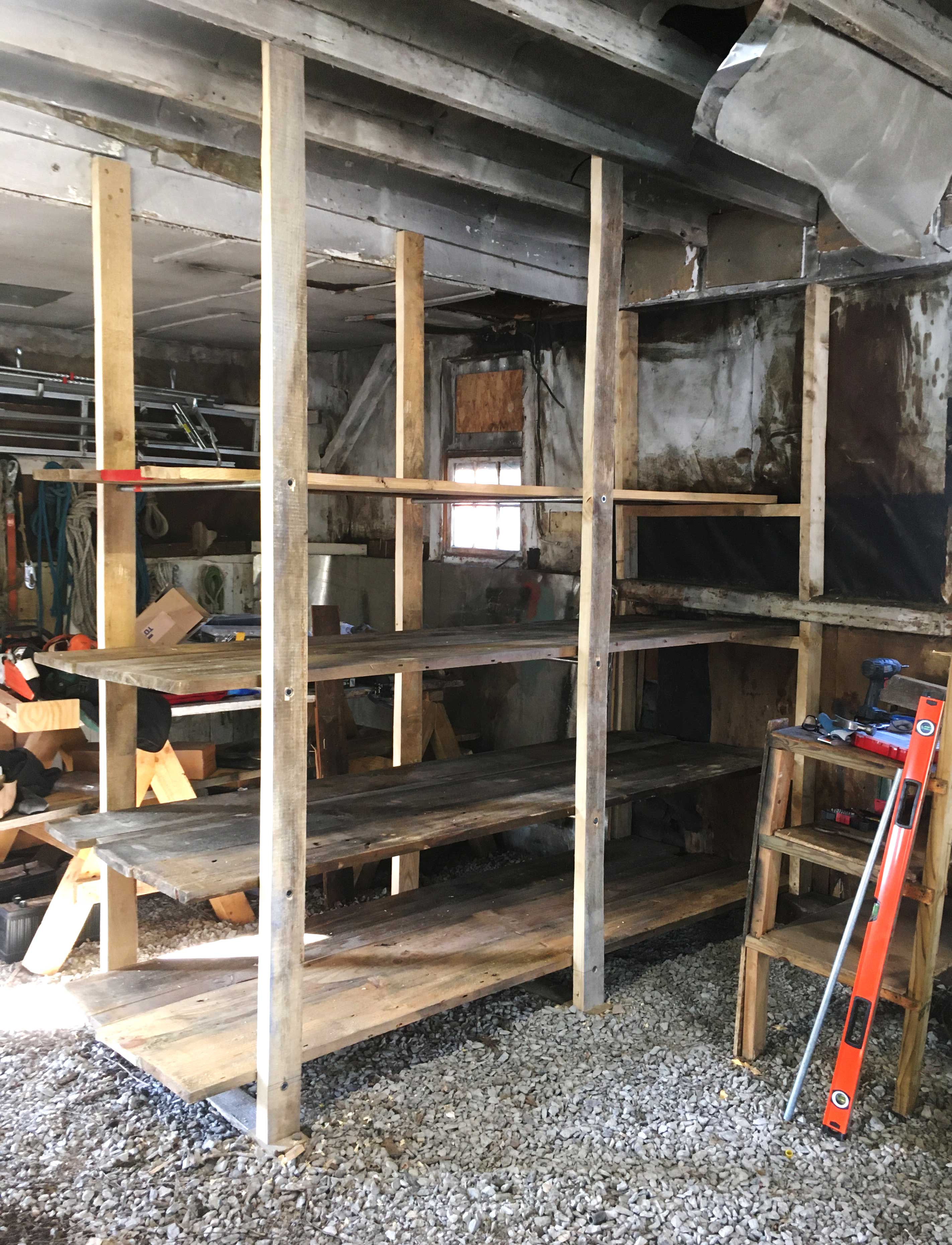 Very simple design that I copied from a wood shop lumber storage rack I saw. The shelves are held up by 3/4" galvanized steel pipe. This is much stronger, faster, and cleaner than building the structure out of more 2x4's. Also it takes up much less vertical space, helping you see deeper into the shelves, especially once they're filled up with stuff. Dimensionally, this installation worked out perfectly, because I could cut 10' long pieces of tubing into exact thirds, and it matched the spacing of two joist-bays where the verticals are anchored at the top. The bottoms are anchored to "sleepers" on the gravel floor, which are just resting there, bedded into the gravel. I was surprised at how solid that arrangement was. Build took two four-hour days.
