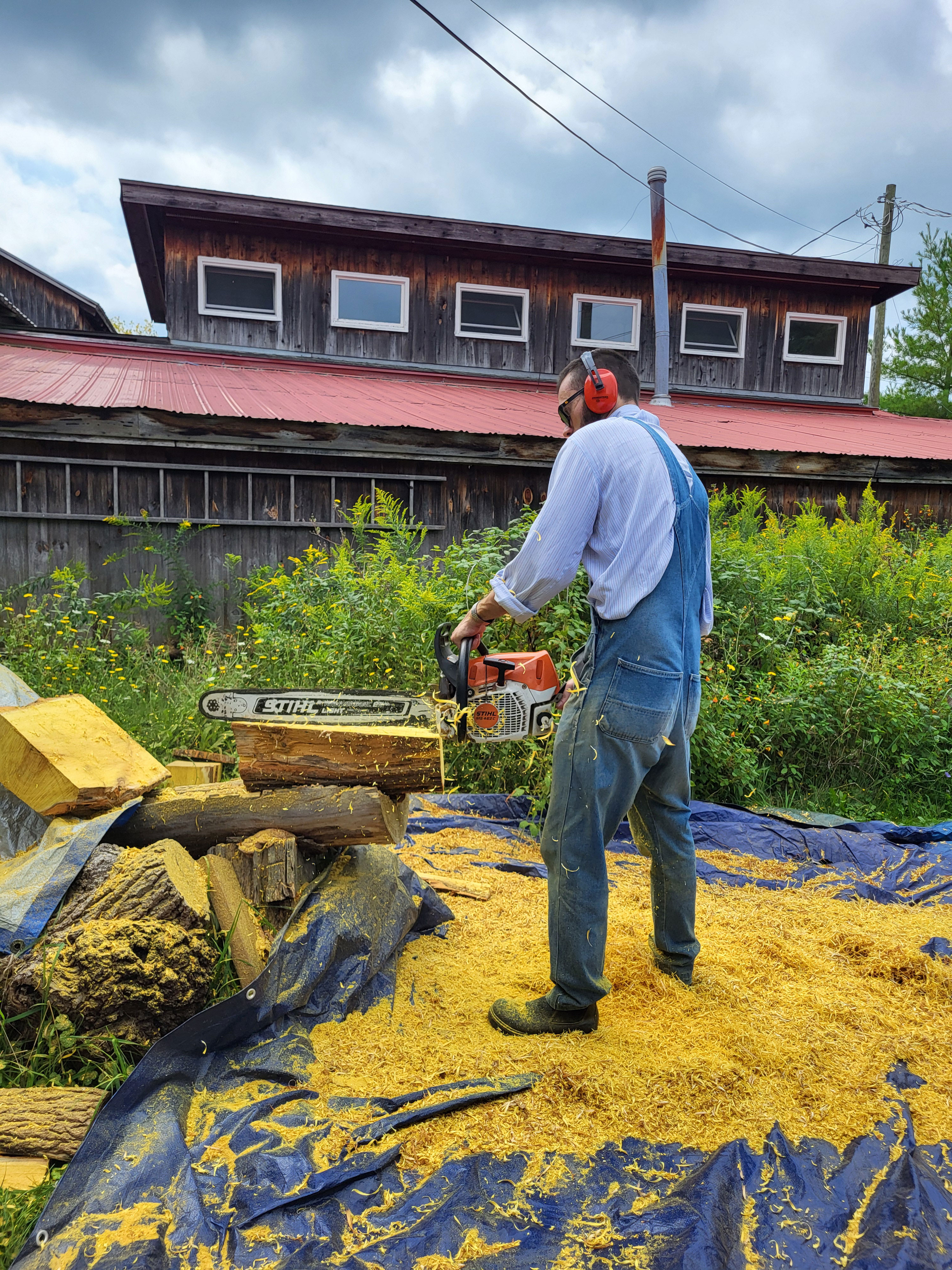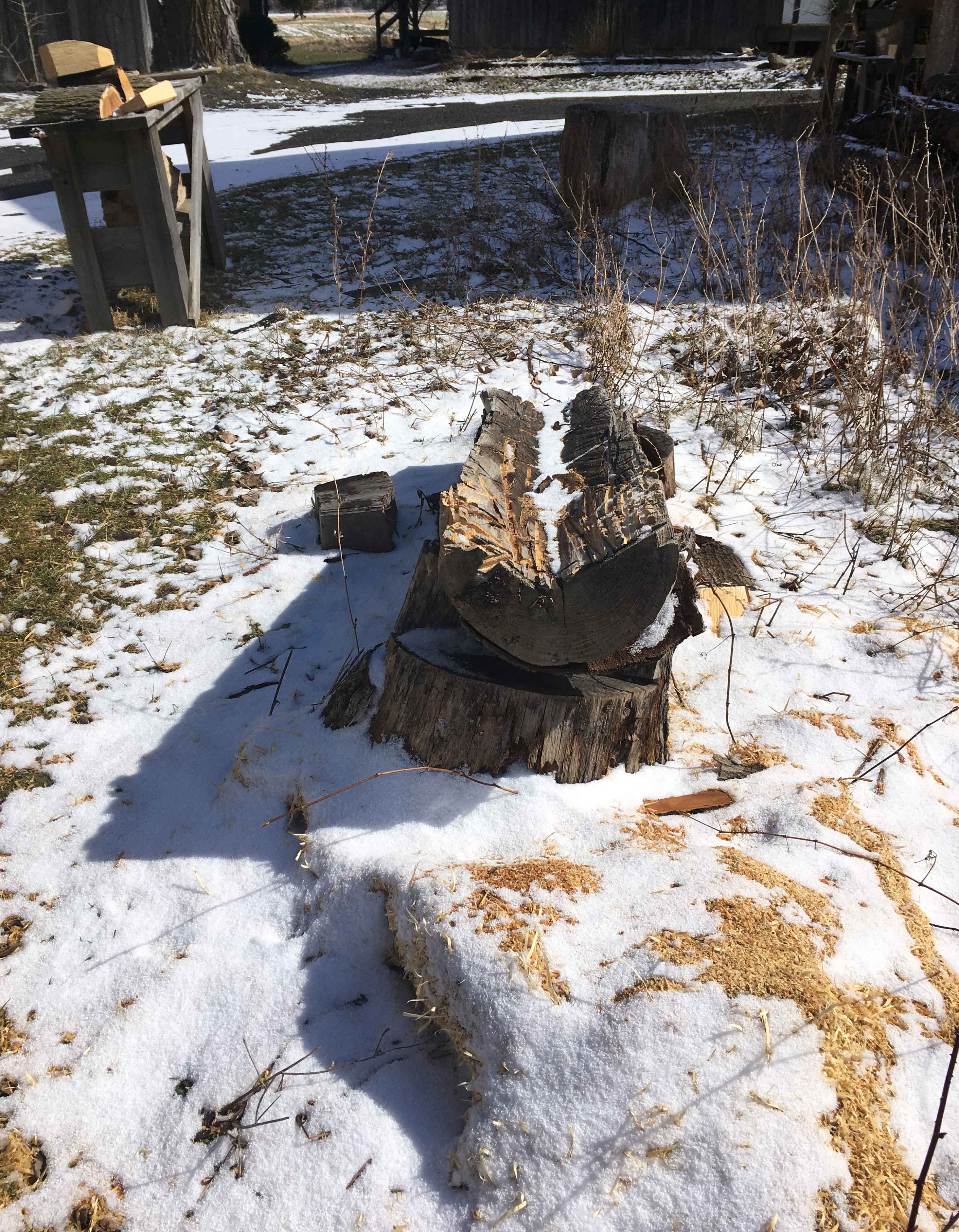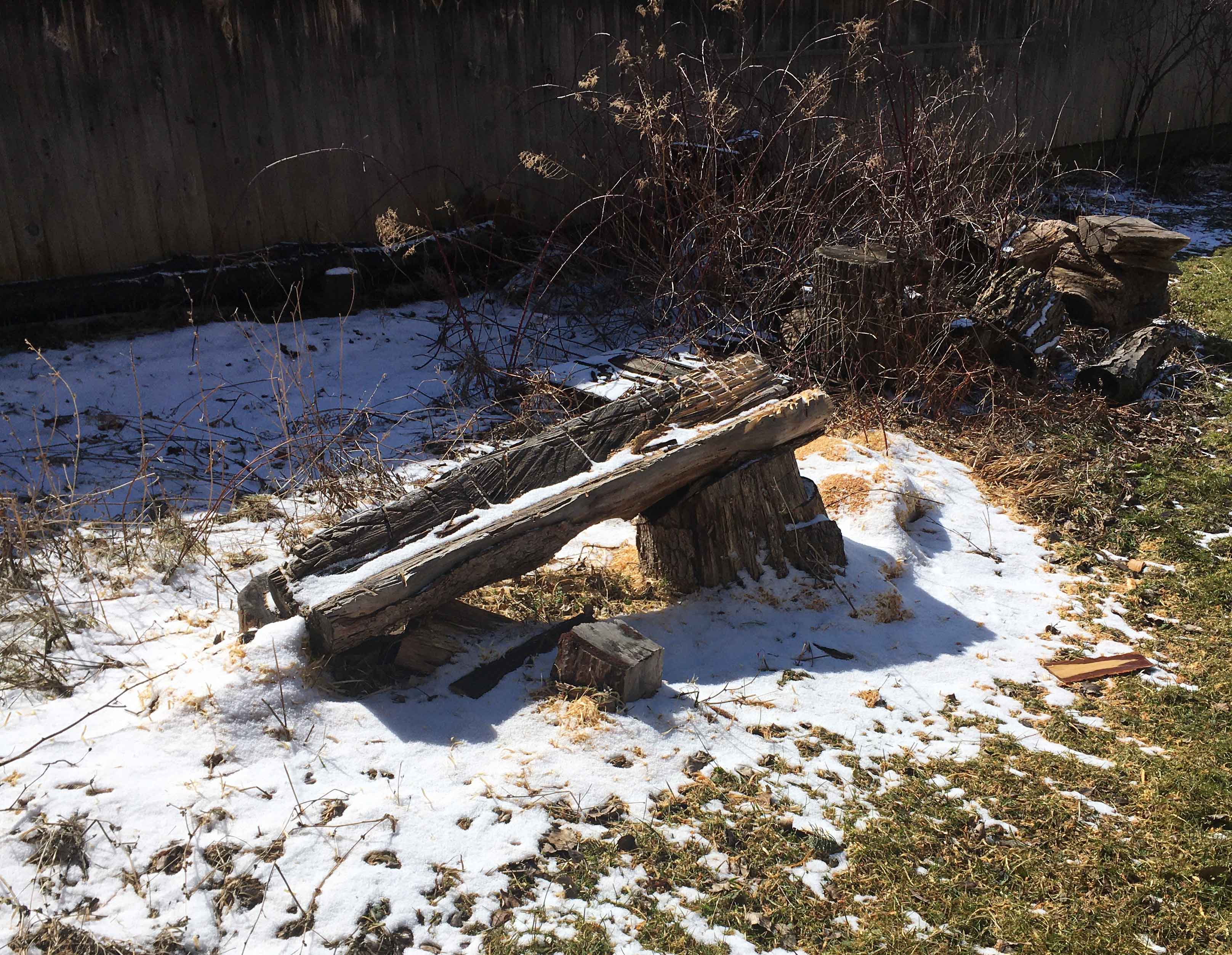 This sawbuck is used primarily for holding medium sized wood rounds and crotches while they are sectioned into bowl-turning stock using a chainsaw. It works particularly well for the first three ripping cuts: the piece is sectioned in half down the pith, with parallel flats trimmed off either side to regularize the piece. If it’s thin enough, it can be band-sawn in a circle, otherwise it is octagonalized and then hexadecagonalized with the chainsaw. During this process, the pieces get smaller and lighter as more and more wood is taken away, and they get harder to manage and more likely to fly around. Likely there is a better sawbuck design out there for those later stages of the process: going from square to octagon, and then cutting those corners off again. But for ripping this is great. It also serves as a general storage and display table for chunks as we’re first deciding how to go about cutting them.
